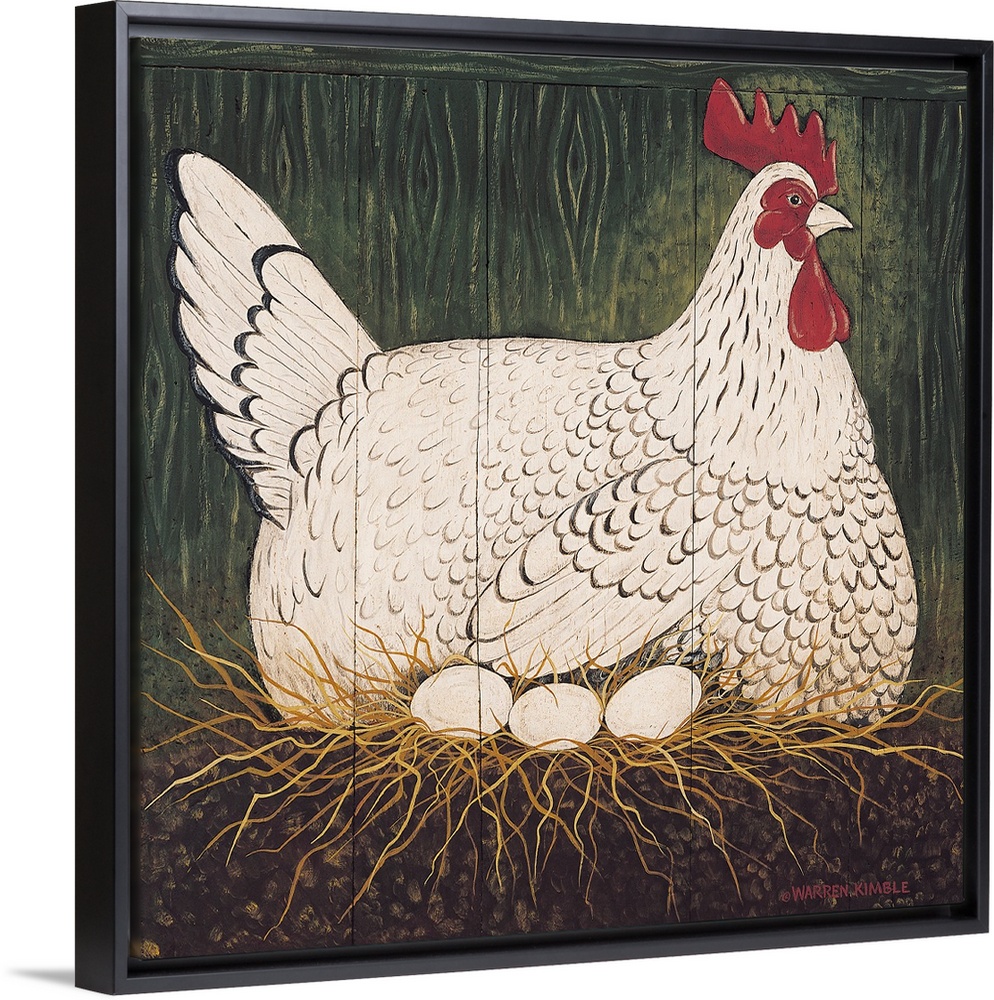 <p>Americana farm animal scene. Image of a large chicken sitting in its nest with three eggs on panel wood pieces.</p>