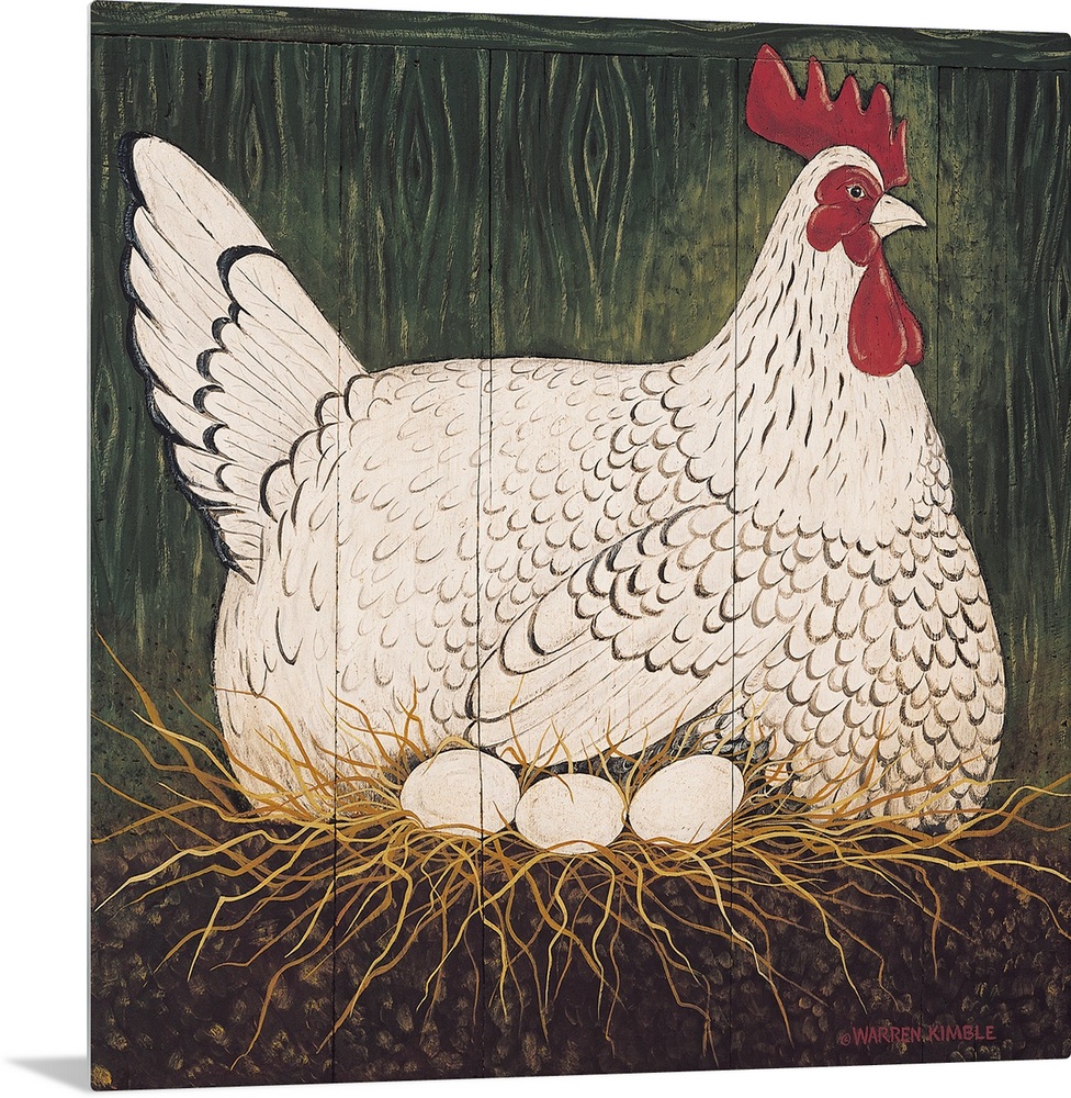 <p>Americana farm animal scene. Image of a large chicken sitting in its nest with three eggs on panel wood pieces.</p>