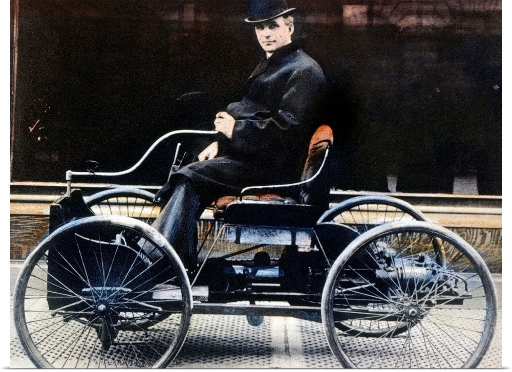 <p>American automobile manufacturer. Ford in 1896 with the first Ford automobile. Oil over a photograph.</p>