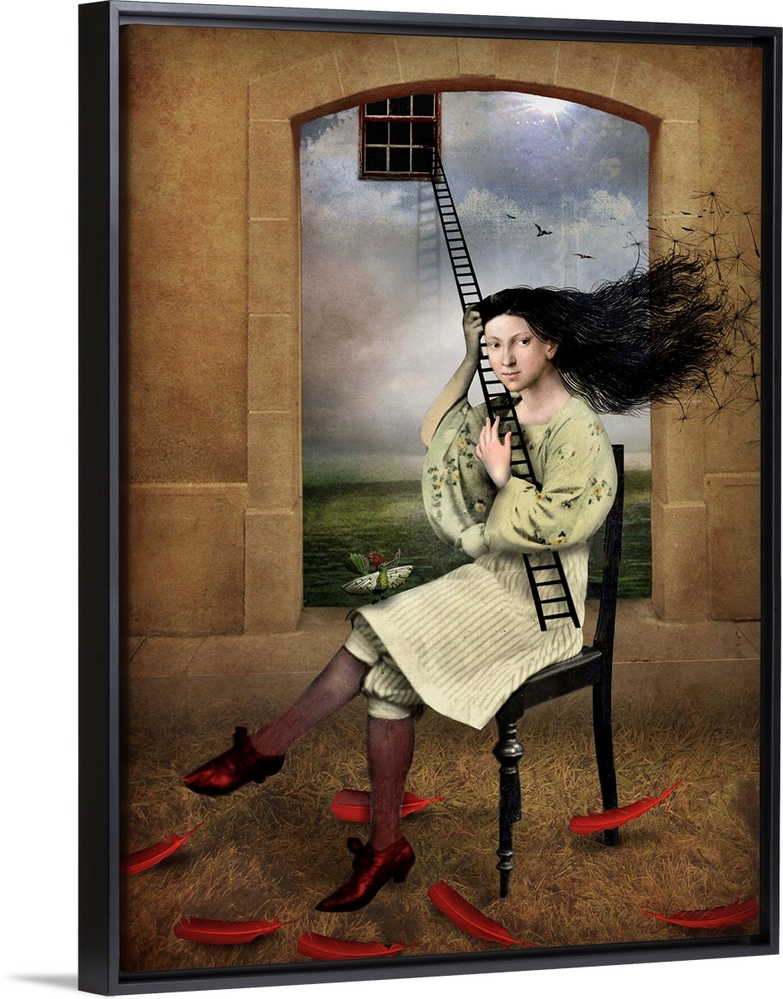 <p>An abstract design of a female holding a ladder to a window with red feathers at her feet.</p>