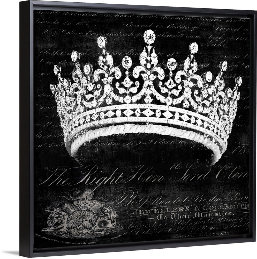 <p>Square decor with a silver crown in the foreground and white script on the black background.</p>