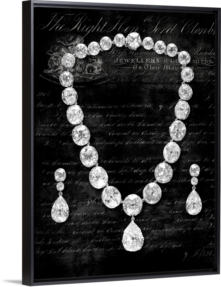 <p>Shiny decor with a diamond necklace and earrings on a black background with white script.</p>