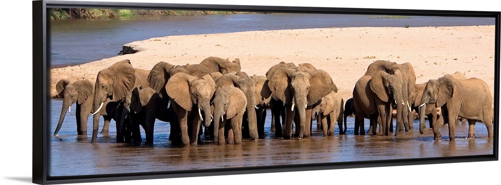 <p>A large panoramic photograph of a herd of elephants standing in shallow water with a patch of land directly behind them.</p>