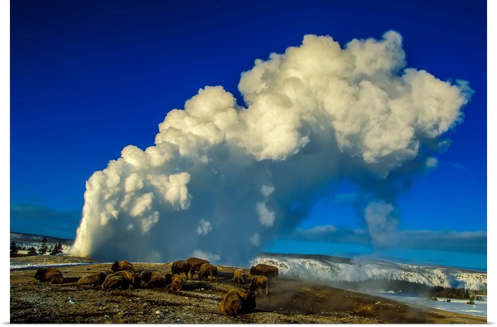 <p>Herd of American bison (Bison bison) grazing and keeping warm near the famous geyser, Old Faithful, with clouds of steam rising into the clear blue sky in the Upper Geyser Basin, Yellowstone National Park, United States of America. Yellowstone's thermal feature provide rare opportunities for wildlife to get relief from the stress of severe winter old. Many of Yellowstone's bison spend at least part of the winter in the shelter of thermal areas. One cold January morning these two bison bulls stood for several hours soaking up the heat from the steam rising from Chromatic Spring in the Upper Geyser Basin. The steam coated the nearby trees and parts of the bison with frost, but at times the steam would envelop the bison long enough to melt the frost and make them sparkle with tiny drops of water. The bison were very pasive and still, saving their energy for when they must leave this thermal oasis and search for food in the nearby heavy snow.</p>