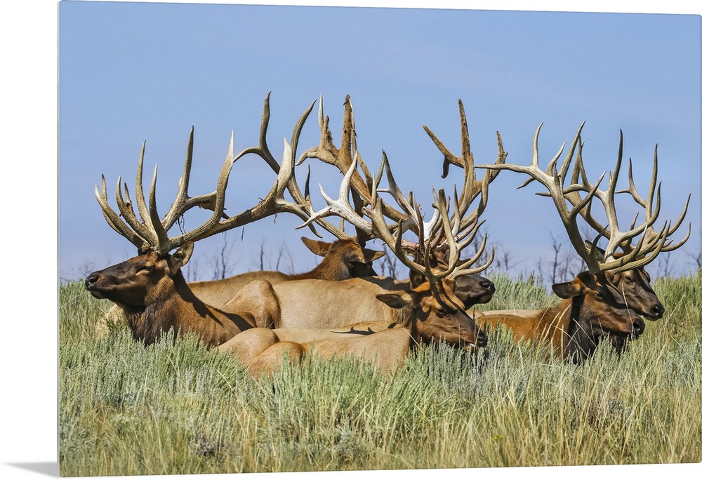 <p>Herd of bull Elk (Cervus canadensis) lying in the grass; Steamboat Springs, Colorado, United States of America</p>