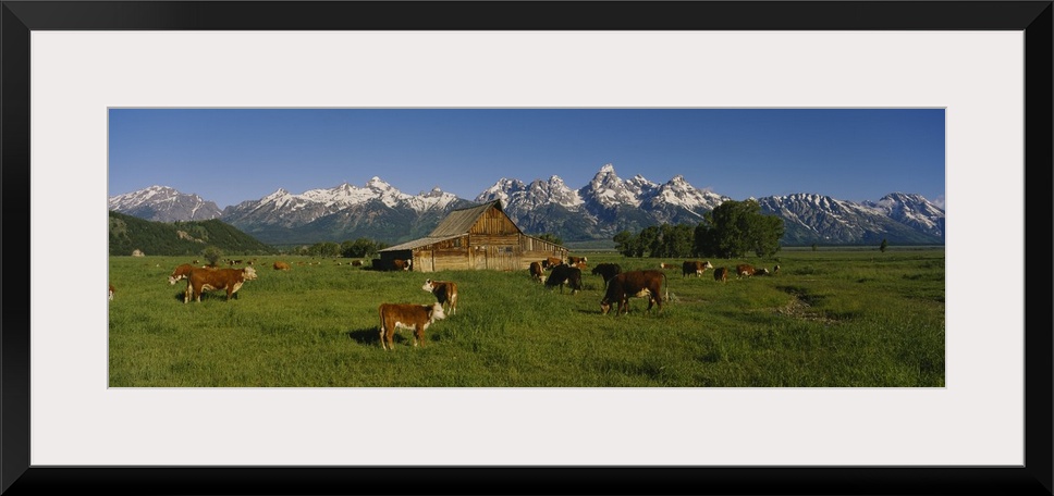 <p>Long and narrow photo on canvas of cows in a pasture with a barn and rugged snowy mountains in the distance.</p>