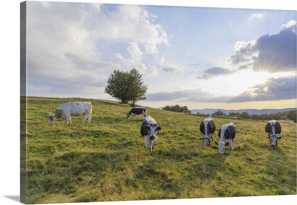 <p>Herd of cows grazing in pasture with the late afternoon sun shining over the fields at Le Markstein in the Vosges Mountains in Haut Rhin, Alsace, France</p>