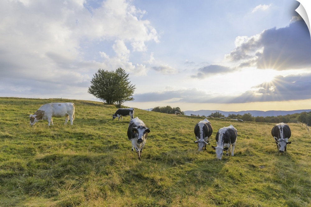 <p>Herd of cows grazing in pasture with the late afternoon sun shining over the fields at Le Markstein in the Vosges Mountains in Haut Rhin, Alsace, France</p>