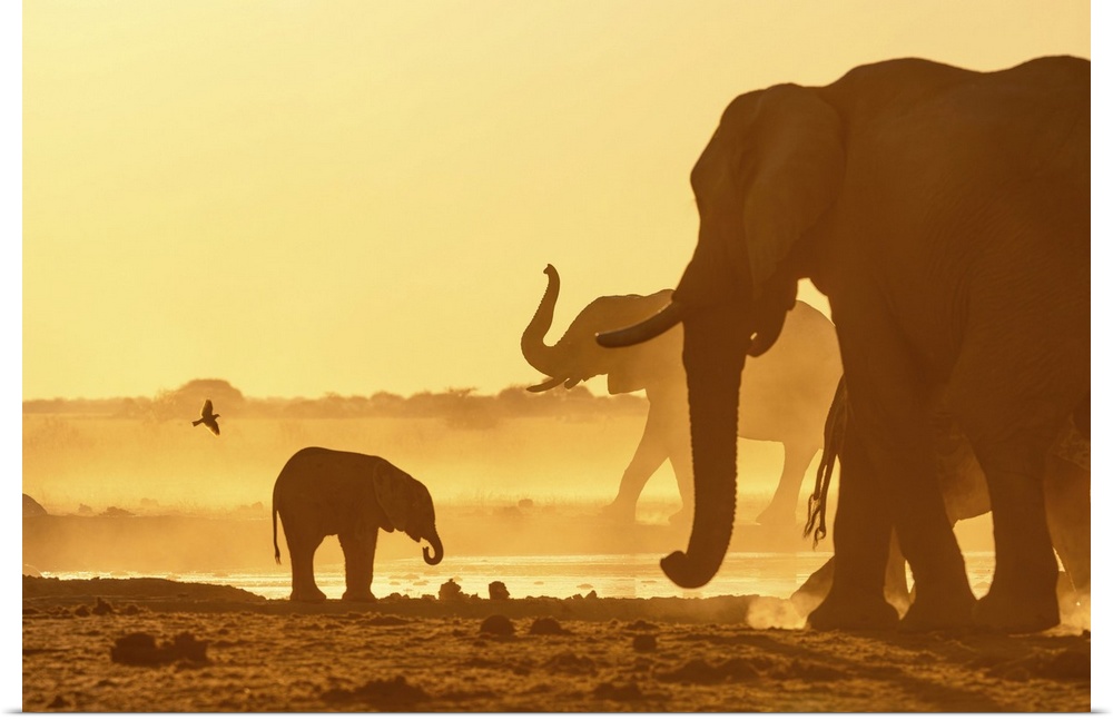 <p>Herd of Elephant in a dusty golden sunset at a waterhole, Nxai Pan National Park, Botswana.</p>
