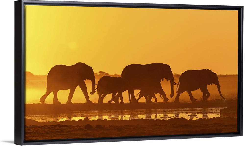 <p>Herd of Elephant walking in a dusty golden sunset at a waterhole, Nxai Pan National Park, Botswana.</p>