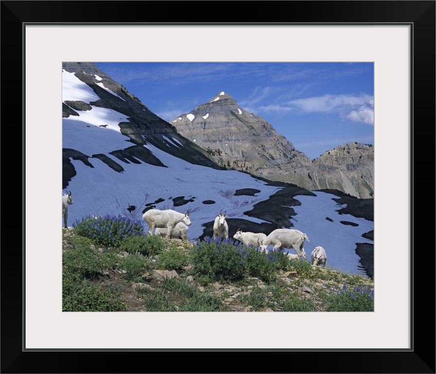 <p>Herd of Mountain Goats (Oreamnos americanus) feed on first Lupine of the year. Mt. Timpanogos Wilderness, Utah.</p>