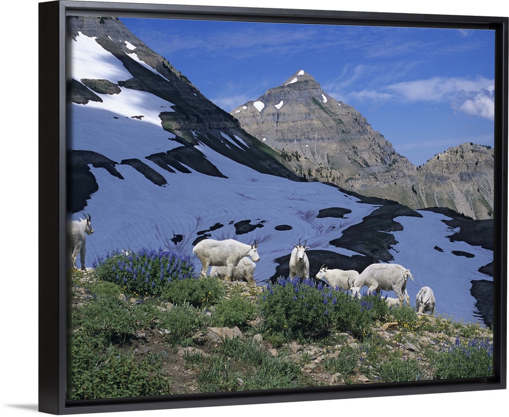 <p>Herd of Mountain Goats (Oreamnos americanus) feed on first Lupine of the year. Mt. Timpanogos Wilderness, Utah.</p>