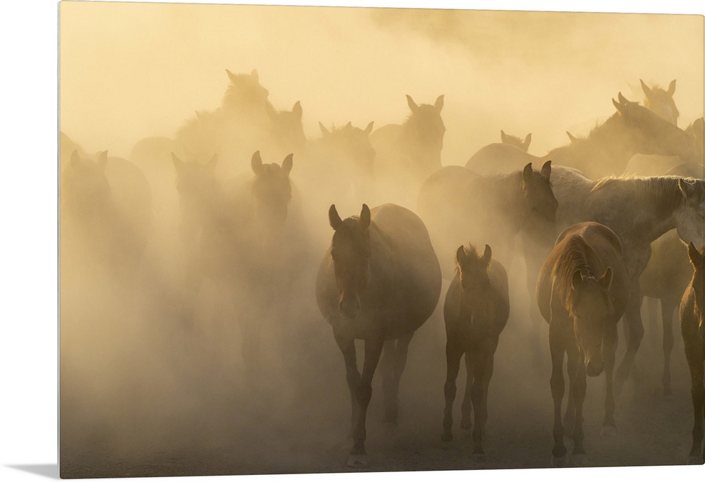 <p>Herd of wild and semi-wild Yilki horses running in dust at sunset, Hacilar, Kayseri, Cappadocia, Anatolia, Turkey, Asia Minor, Asia</p>