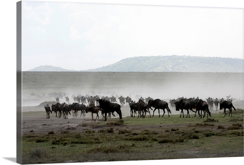 <p>Herd of Wildebeest (Connochaetes taurinus) stirs up dust while moving across Serengeti short grass plains near Ndutu, Ngorongoro Crater Conservation Area. Tanzania.</p>