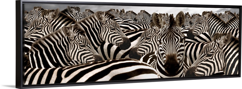 <p>Wide angle photograph on large canvas of a herd of zebras beneath a cloudy grey sky.</p>