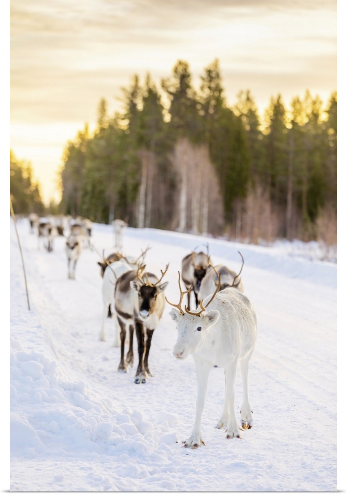 <p>Herding reindeer in beautiful snowy landscape of Jorn, Sweden, Scandinavia, Europe</p>