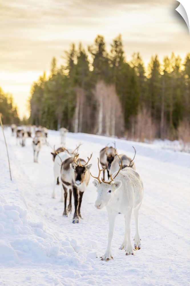 <p>Herding reindeer in beautiful snowy landscape of Jorn, Sweden, Scandinavia, Europe</p>