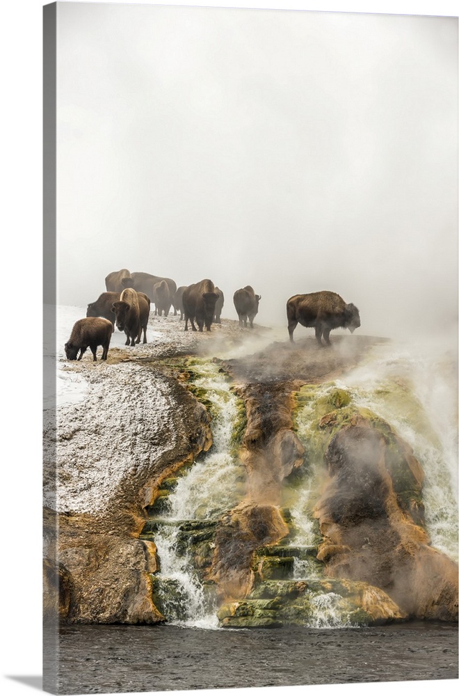 <p>Herd of American bison (Bison bison) on top of a cliff surrounded by steam from the Excelsior Geyser at the Midway Geyser Basin looking over the Firehole River in Yellowstone National Park, Wyoming, United States of America</p>