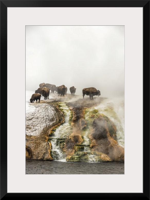 <p>Herd of American bison (Bison bison) on top of a cliff surrounded by steam from the Excelsior Geyser at the Midway Geyser Basin looking over the Firehole River in Yellowstone National Park, Wyoming, United States of America</p>