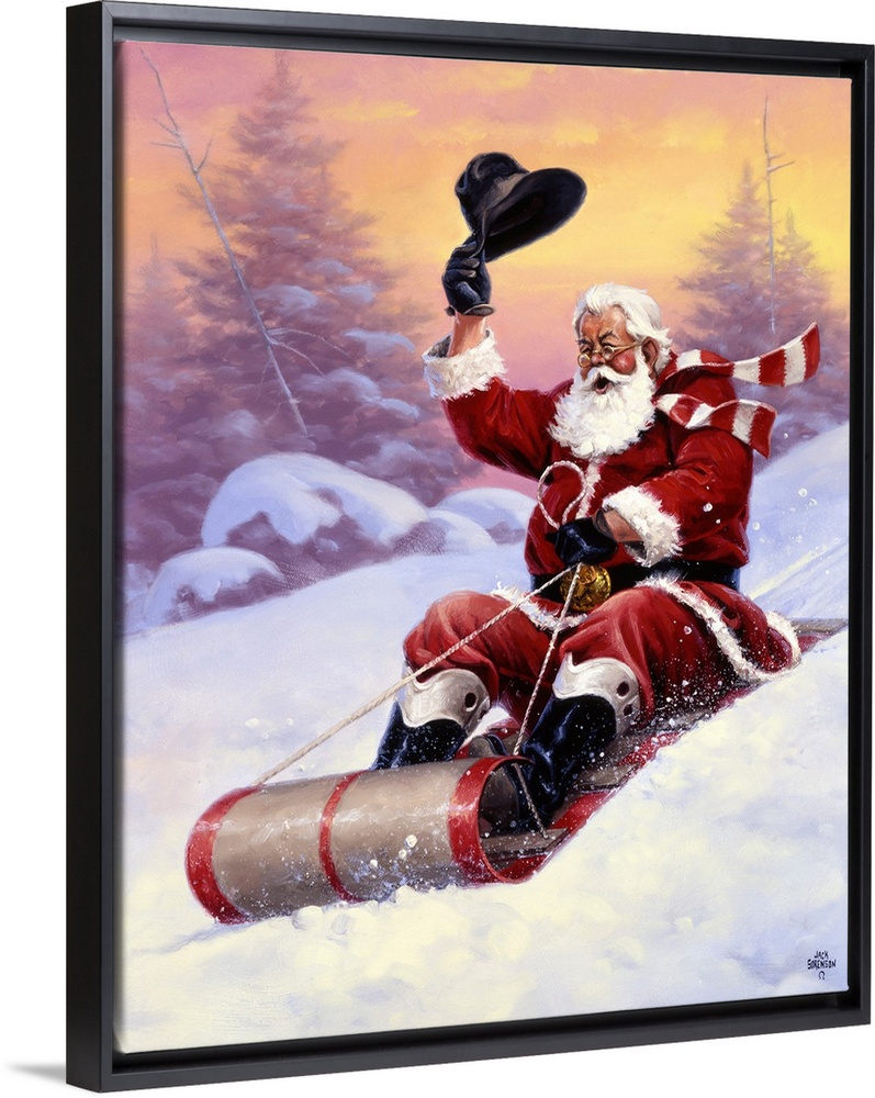 <p>A whimsical yet traditional painting of Father Christmas riding downhill on a sled and waving his hat in the air.</p>