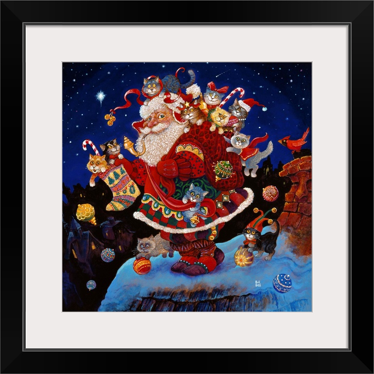 <p>Contemporary painting of jolly St. Nick covered in cats on a snowy roof.</p>