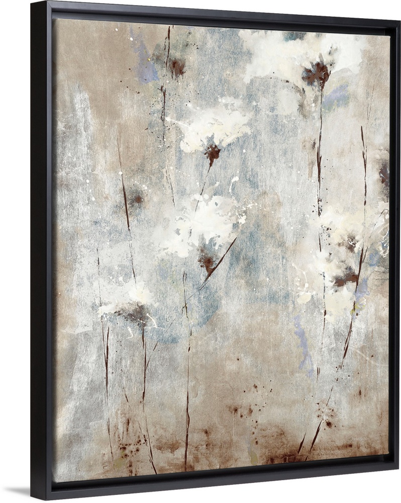 <p>A soft, contemporary painting of whispy white flowers on a neutral background with blue tones</p>