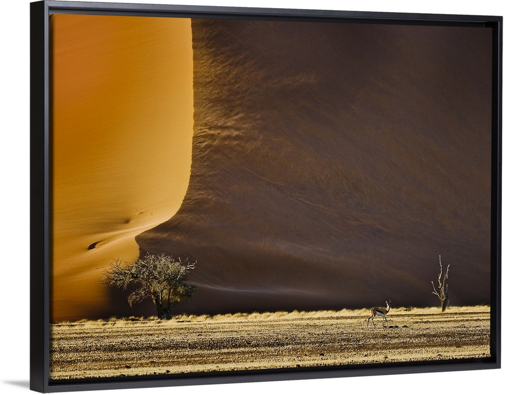 <p>An antelope appears tiny in front of the massive sand dunes in the desert.</p>
