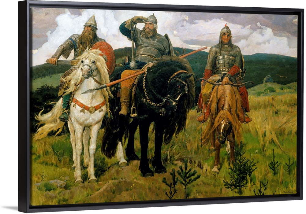 <p>Heroes (Bogatyri, or Three Bogatyrs). 1881-1898. Oil on canvas. 446 x 295.3 cm (175.6 x 116.3 in). Tretyakov Gallery, Moscow, Russia. Depicts the three epic heroes or knights of Russian legend: Ilya Muromets, Dobrynya Nikitich and Aliosha Popovich.</p>
