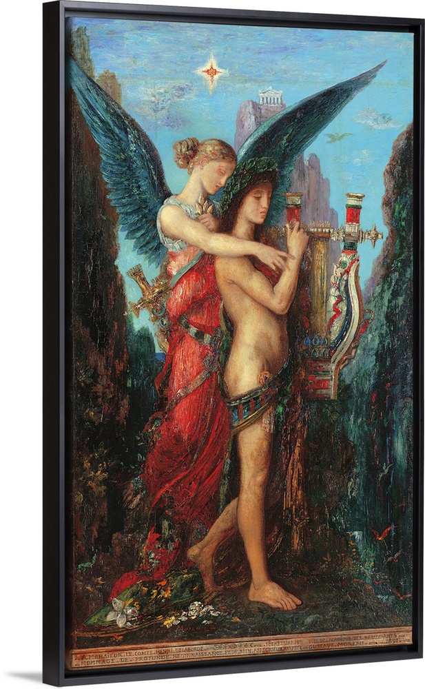 <p>Hesiod and the Muse, by Gustave Moreau, 1891, 19th Century, oil on panel, cm 59 x 34,5 - France, Ile de France, Paris, Muse dOrsay, RF1961-7. All. Hesiod and the Muse mountain young woman long gown wings star temple red azure light blue lyre flower sword.</p>