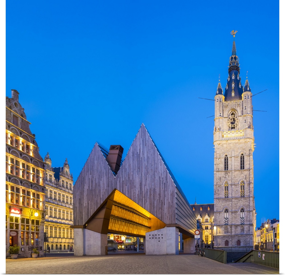 <p>Belgium, Flanders, Ghent (Gent). Het Belfort van Gent, 14th century belfry, and Stadshal, City Pavilion, designed by architects Robbrecht and Daem / Marie-Jos? Van Hee, at dusk.</p>