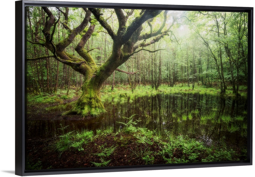 <p>Beech trees hanging over a swamp in a forest.</p>