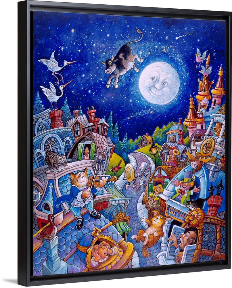 <p>A cow jumping over the moon, with dogs, cats, people, and birds watching.</p>