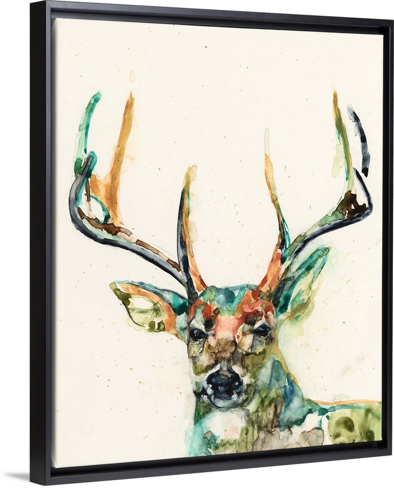 <p>Watercolor portrait of a deer in a variety of bright colors.</p>