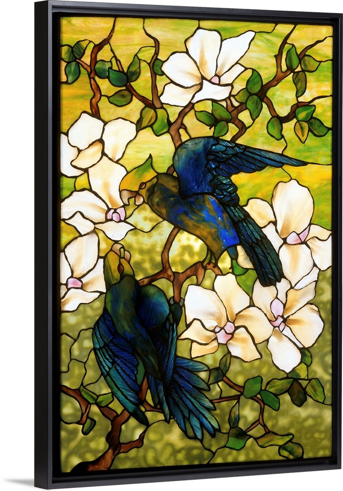 <p>This vibrant window of hibiscus and parrots reveals Tiffany's brilliant use of color and texture. Shading within the glass creates form for the birds' heads, and the mixed blues and greens produce their dramatic plumage, with the tail feathers given greater realism through the texture of the glass. Tiffany's distinctive mottled glass gives the impression of sunlight filtered through the foliage. The window's small size and secular subject suggest that it was intended for a domestic setting.</p>