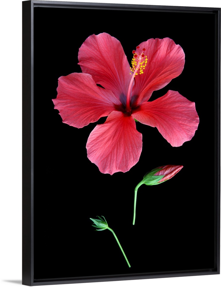 <p>Red hibiscus flower in three stages of opening, a tight green bud, bud with the red petals beginning to show and a beautiful hibiscus flower in full bloom, on a black background.</p>