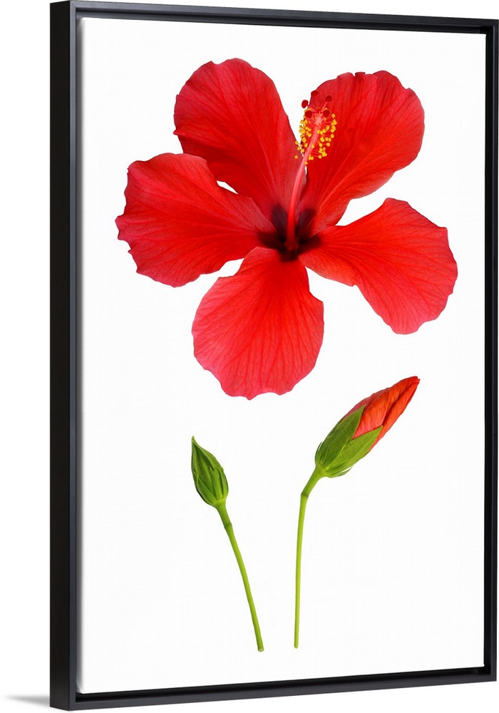 <p>Red hibiscus flower in three stages of opening, a tight green bud, a bud showing the petals rolled and ready to open and the bloom fully open, on a white background.</p>