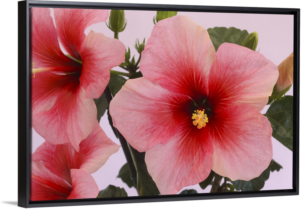 <p>Close-up of hibiscus flowers softly toned from red through to pink on a pale pink background.</p>