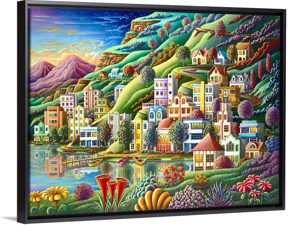 <p>Contemporary painting of a village on a lake surrounded by vivid colorful foliage.</p>