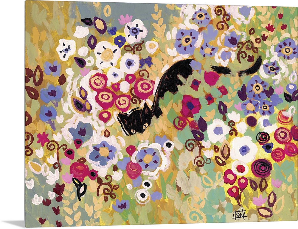 <p>Contemporary painting of a black cat hiding in flowers.</p>