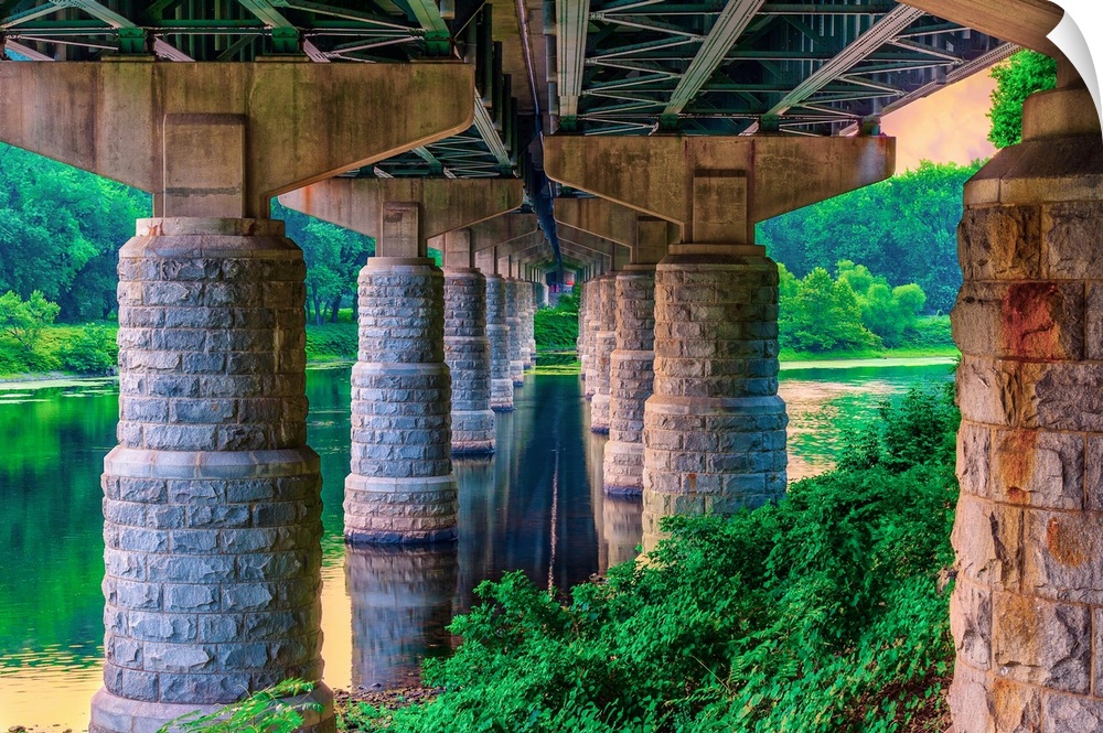 <p>Stone pillars under a bridge, standing in the water.</p>