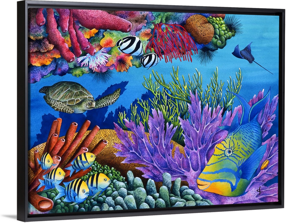 <p>Tropical themed artwork using bright vivid colors to depict the flowers and animals of the environment.</p>