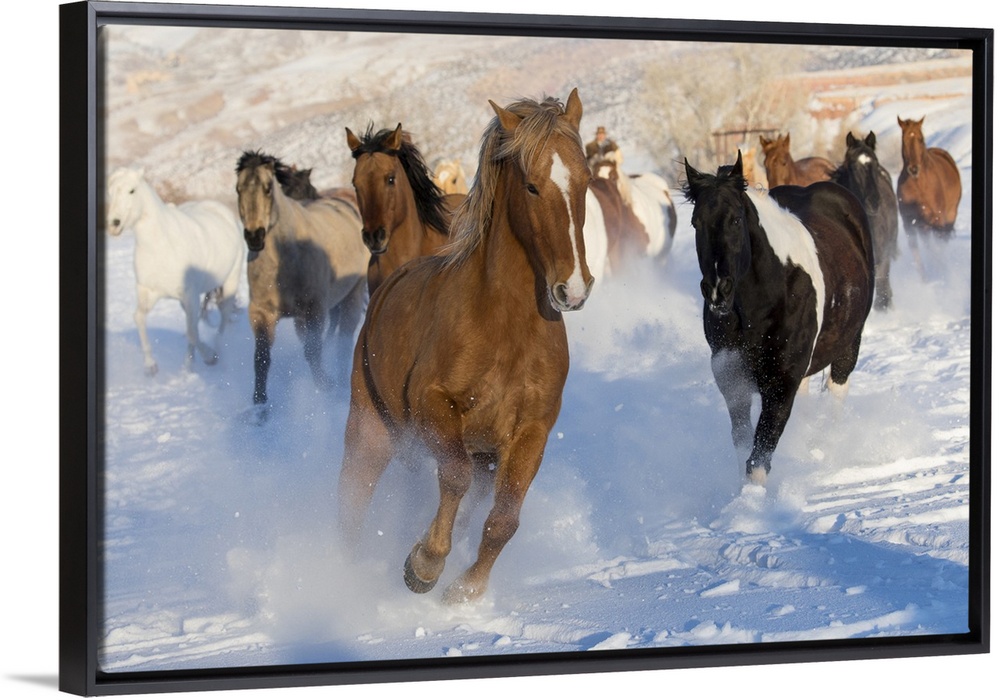 <p>Horse drive in winter on Hideout Ranch, Shell, Wyoming. Herd of horses running in winters snow.</p>