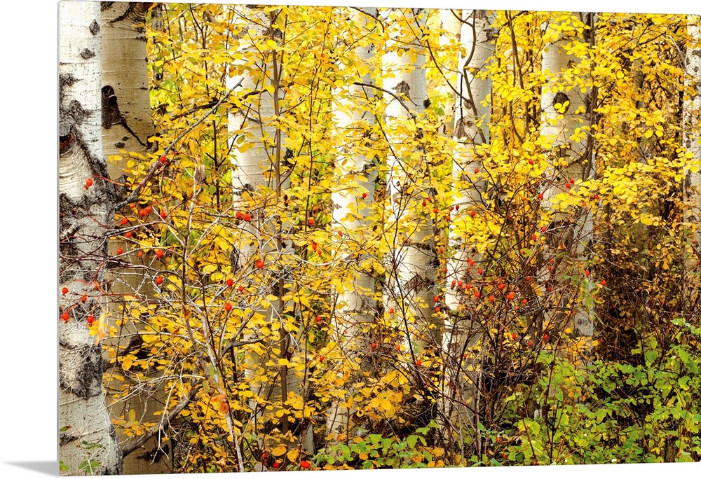 <p>Photograph of a bush of red berries among golden leaved trees in a forest.</p>