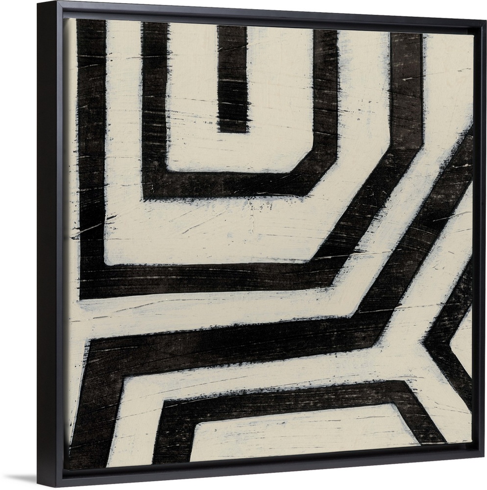 <p>Black and white abstract artwork made of angled lines.</p>