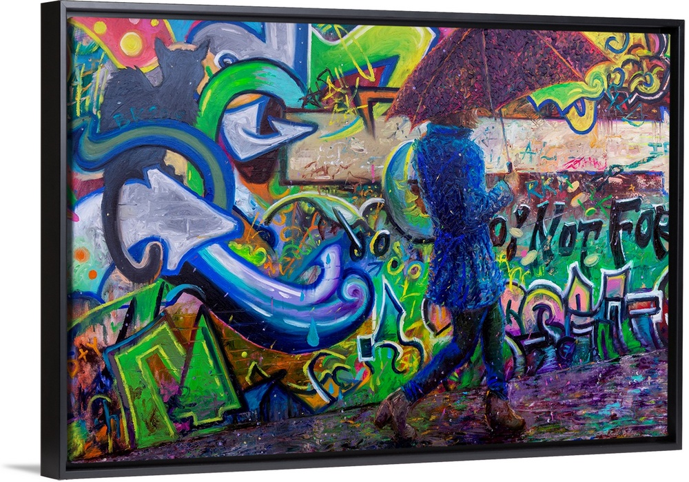 <p>Brightly colored contemporary artwork of a woman walking alongside graffiti.</p>