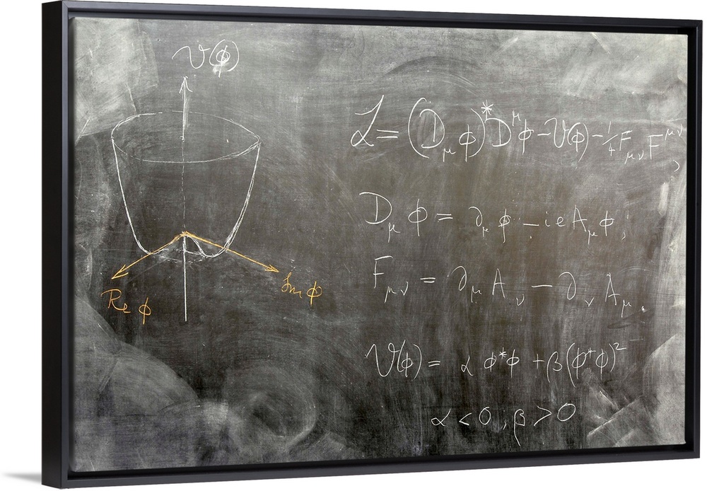 <p>Higgs mechanism equation on a blackboard. The Higgs mechanism explains how the Higgs field confers mass on other particles through their interaction with it. This interaction is mediated by the Higgs boson, a fundamental particle. The Higgs boson is required by many of the Grand Unified Theories which hope to explain three of the fundamental forces (electromagnetism and the weak and the strong nuclear forces) in a single unified theory. The discovery of a particle consistent with the Higgs boson was announced by scientists at CERN (the European particle physics laboratory) on the 4th July 2012. Further analysis will be needed to confirm the results.</p>