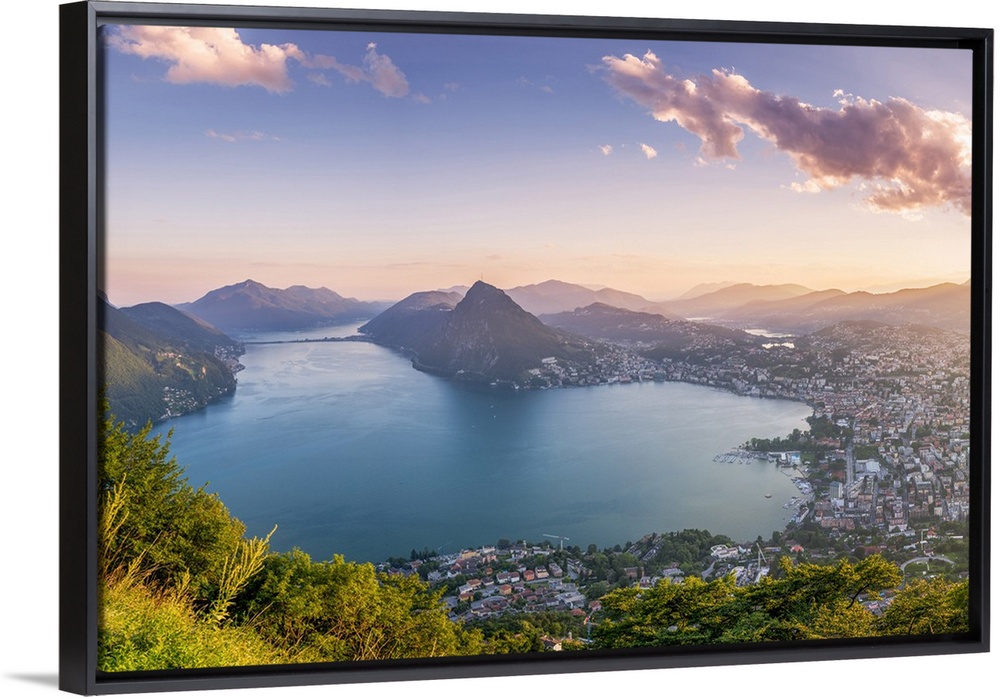 <p>Lugano, lake Lugano, Ticino canton, Switzerland. High angle view from the Mount Bre at sunset.</p>