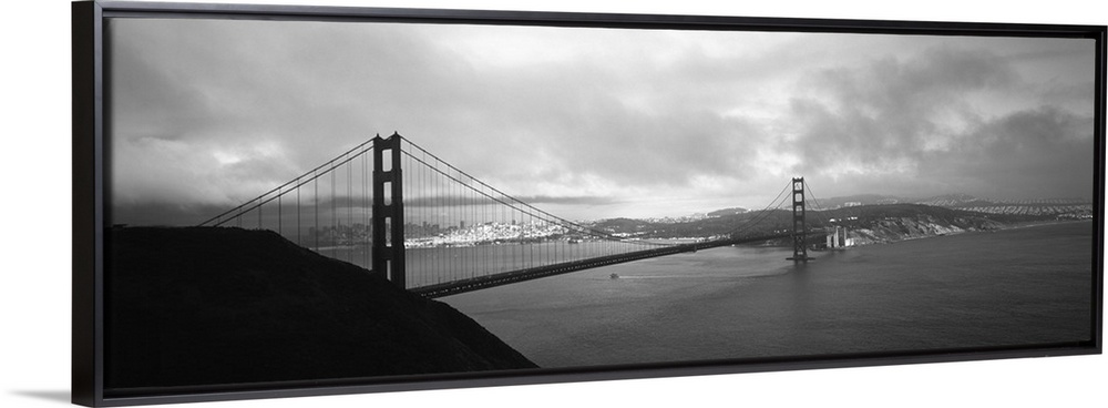 <p>Giant black and white photograph of the Golden Gate Bridge in San Francisco, California (CA) on a cloudy day with some sun rays breaking through the clouds.</p>