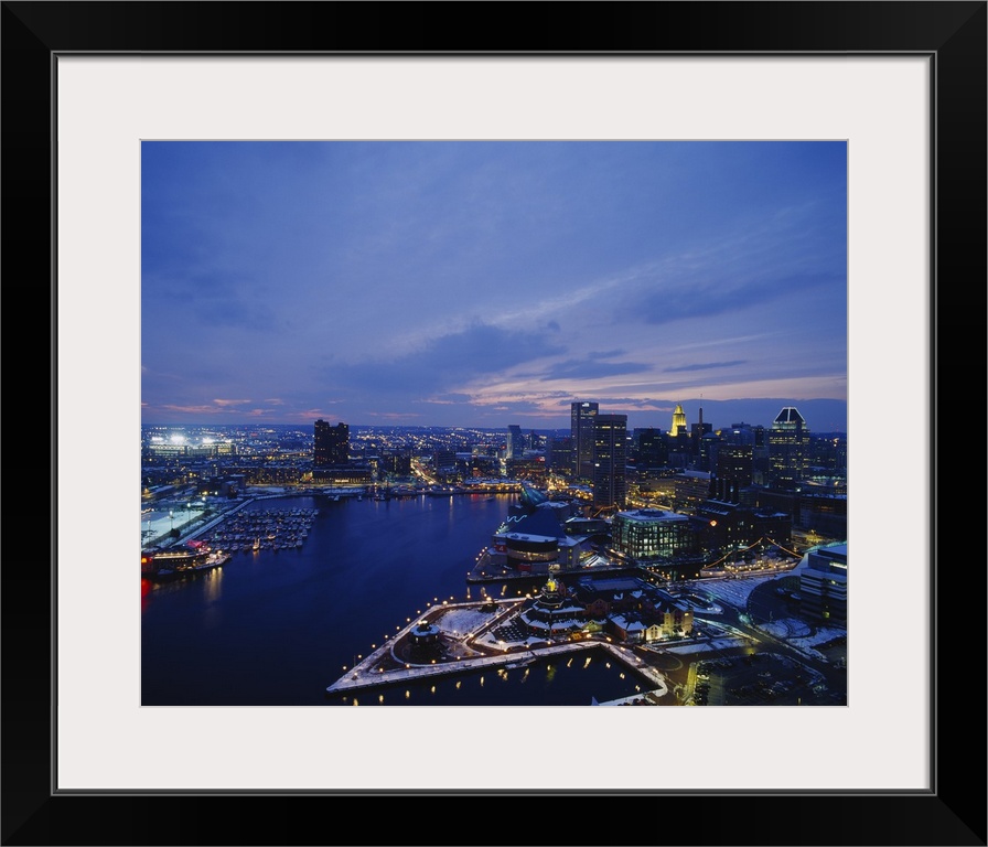 <p>Large photograph taken from an aerial view over the calm waters of the Inner Harbor within a busy city in the Northeastern United States. The bright lights of the skyscrapers and buildings can be seen all the way to the horizon as the sun begins to set.</p>
