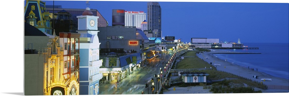<p>Panoramic photograph of skyline along boardwalk and oceanfront at dusk.</p>
